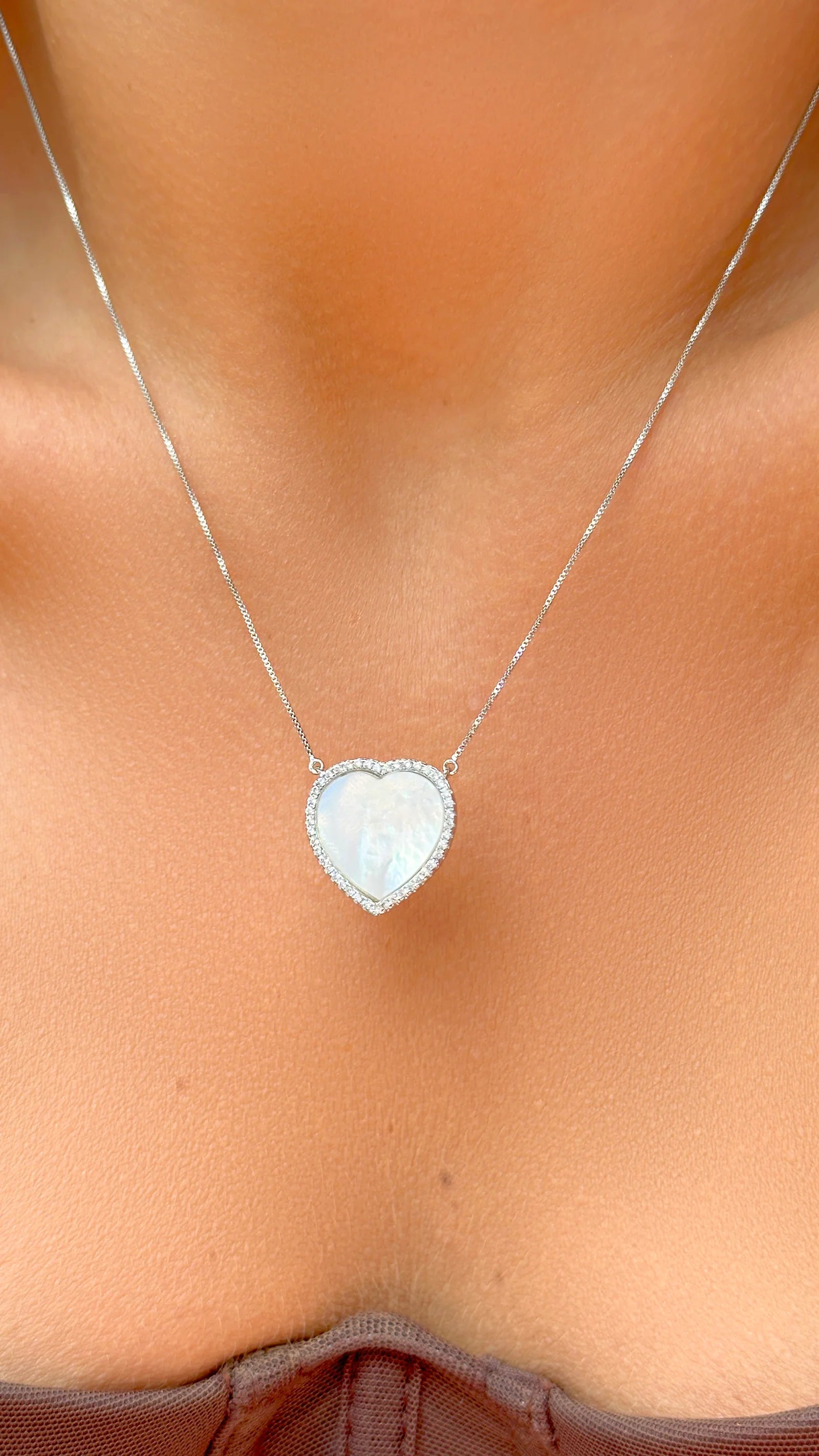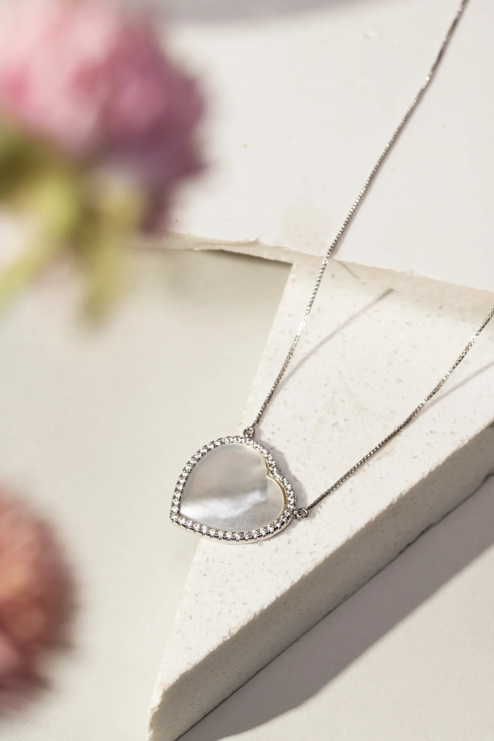 This elegant necklace features a delicate heart pendant crafted from shimmering mother of pearl, accented with sparkling white zircon stones.