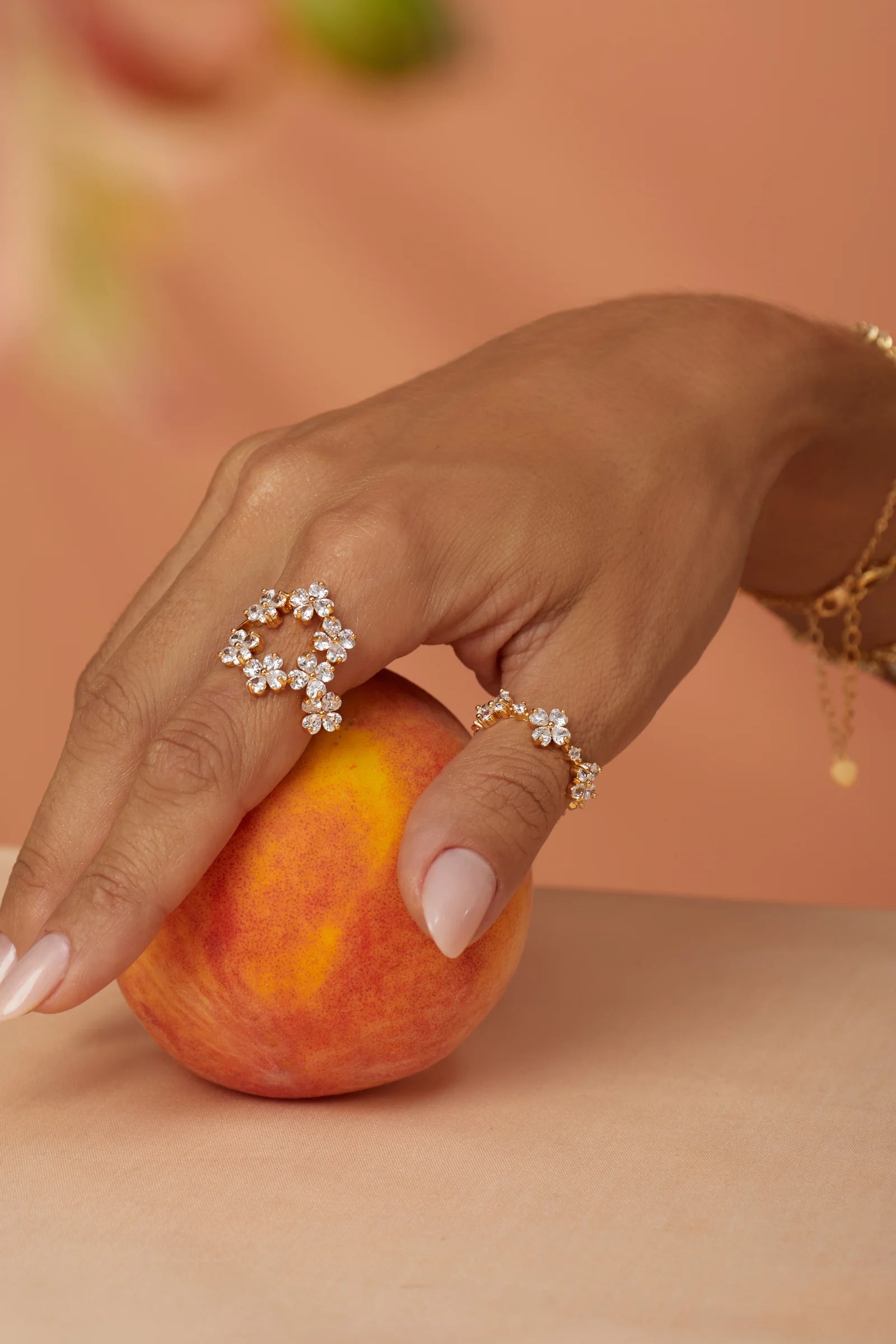 Delicate and ethereal, this open ring features seven blooming flowers crafted in 18k gold plating, each adorned with sparkling white zircon stones.